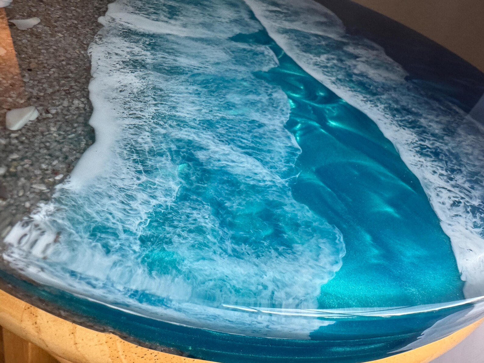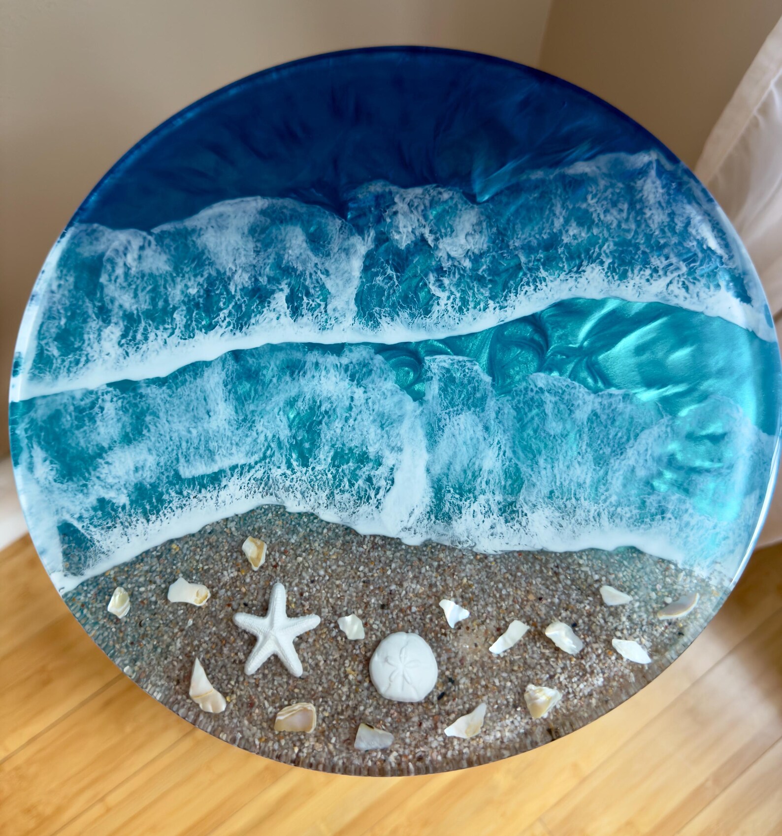 This gorgeous 12 inch ocean resin tray/table top will look beautiful in any room of your home! Choose from my options or message me with your ideas to create a custom tray/table for you. I can add handles or you can drill holes to add legs or a base. The tray measures 12 inches in diameter and you choose 1/2 of an inch or 1 inch thickness.